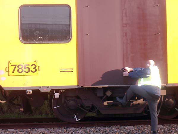 Jort en ik hebben de treinen van onder en van boven bekeken. We snapten alleen niet dat ze eerst een kuil graven onder de trein en er dan weer een trap in zetten (zie voorgrond) om aan de onderkant te kunnen werken.